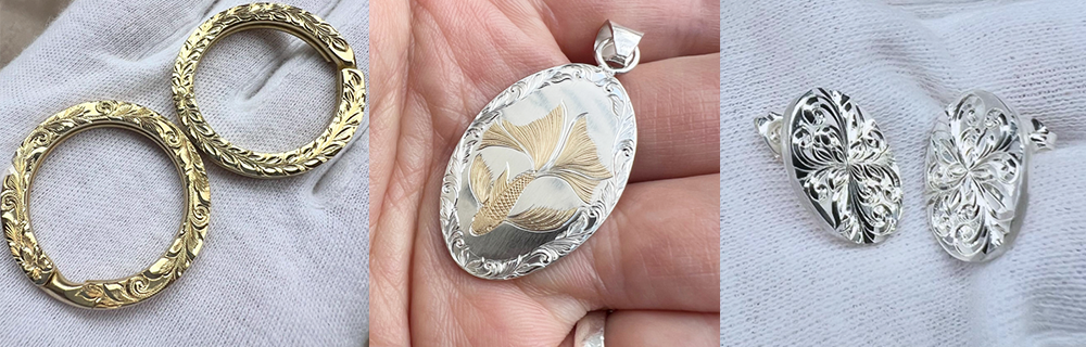 「和彫り」や「ハワイアンジュエリーの彫り」とは異なったフィレンツェ彫りの独特な繊細な手彫りによる彫刻面の美しさだけでなく、彫らずに残った面との美しい演出を施してありました。