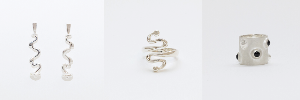 シンプルながら、エッジの効いたデザイン、個性的な石を日常使いできるよう丁寧に留めたリングなど、コンセプト通りの対比を表現した、とてもすてきなジュエリーでした。